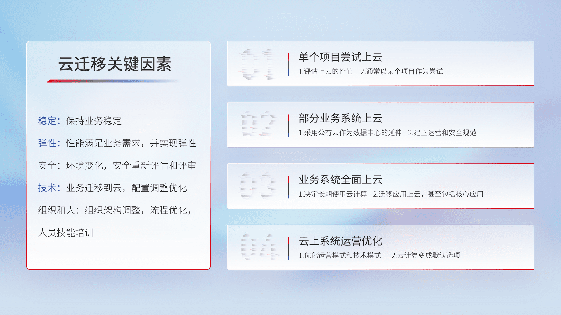 结合实际业务,,,从规划设计、、、、云平台选型、、、、云原生改造、、、数据迁移、、、、集成交付,,迁移全过程为客户识别最佳上云路径,,,,做好风险识别管理,,,设计网络架构、、身份权限、、、安全审计合规、、、操作审计、、日志审计、、、、监控告警策略、、、、多站点容灾设计等,,,,对云上基础设施进行整体规划,,提升IT治理水平,,,,以满足弹性、、、高可用、、、高性能的需求。。。