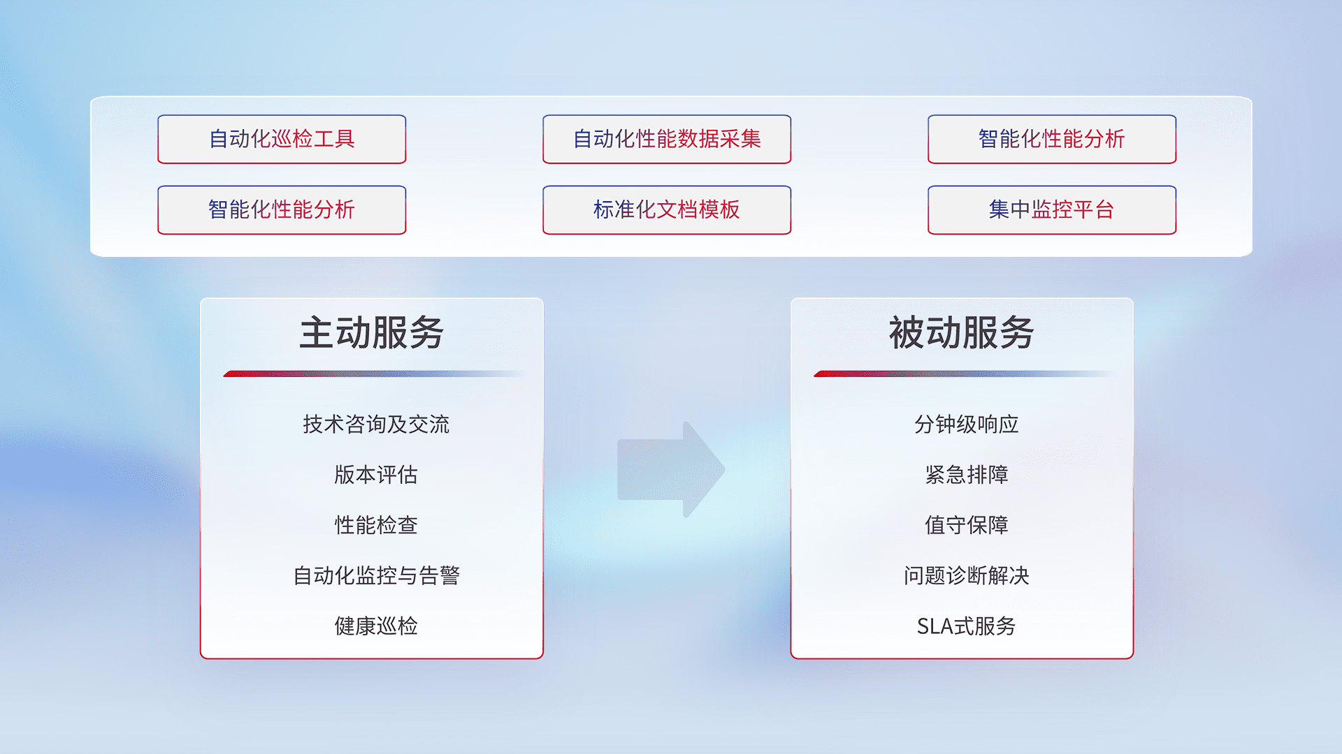 智能化工具和标准化文档,,,保障服务质量,,,提供主动服务(包含技术咨询、、、版本评估、、性能检查、、、、自动化监控与告警、、、、健康巡检)和被动服务包含(分钟级响应、、、紧急排障、、、、值守保障、、、、问题诊断解决、、、SLA服务)。。。