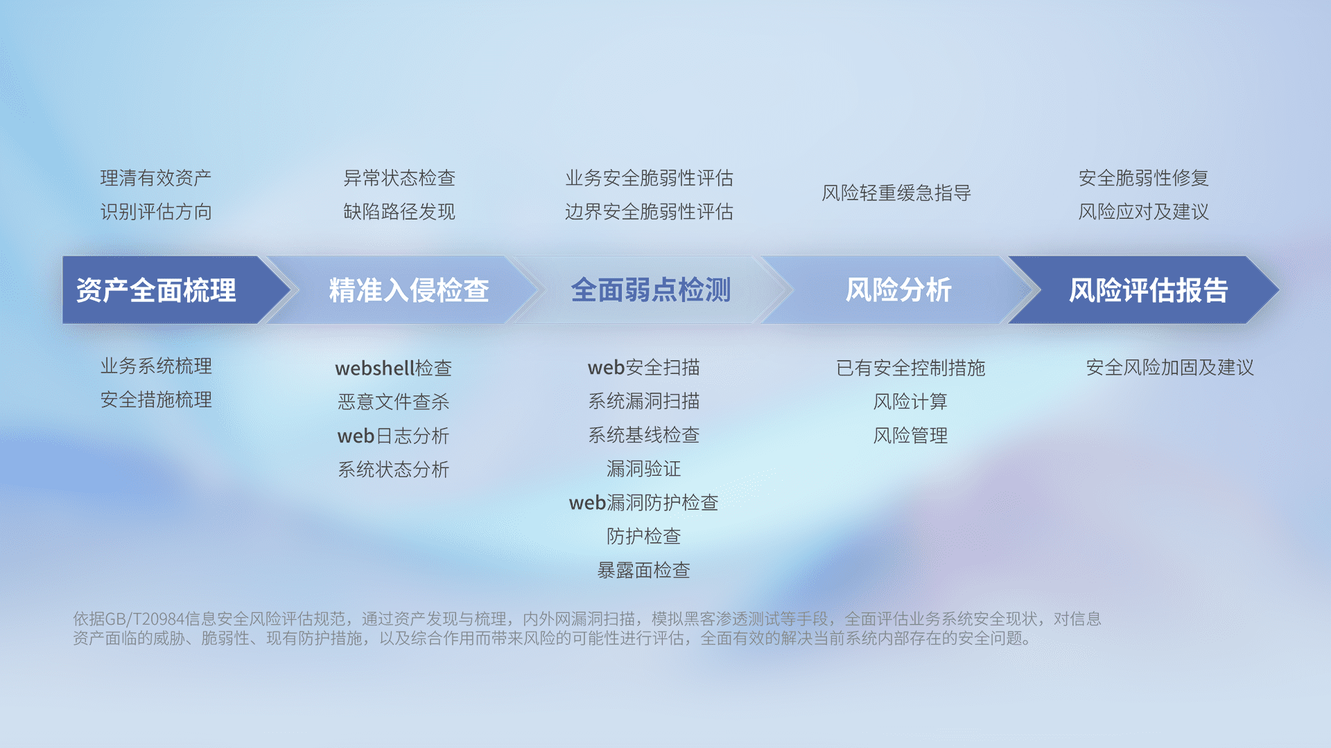 针对客户行业特性,,,,以专业的安全服务+多厂商联合解决方案提供专属的一站式安全管理服务,,帮助客户全面感知网络空间威胁,,基于识别、、检测、、分析、、防护、、、监测、、响应的服务理论模型,,,从方案咨询、、集成交付、、、、评估验证、、、、优化加固、、、运维运营,,,致力于为客户提供完整的闭环管理式安全服务。。以实战经验为客户打造高抵御风险的安全体系,,,帮助客户发现威胁、、对抗威胁、、、、处置威胁,,,不断积累安全对抗能力,,持续保障数字化安全。。。。